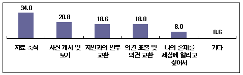 정보통신정책연구원(KISDI) 미래전략연구실 이호영 책임연구원과 정은희 연구원, 이장혁 교수(고려대 경영학과)는 KISDI 연구보고(07-03) ‘Web 2.0시대 디지털 콘텐츠의 사회적 확산 경로 연구’ 보고서에서 주 1회 이상 블로그를 업데이트하는 15세부터 45세 사이의 블로거 500명을 대상으로 수행한 온라인 조사 결과, 우리나라 블로거들이 블로그를 미디어로 생각하기 보다는 스크랩한 자료의 저장 공간(41.6%)이나 사진 게시(20.8%), 안부 교환(18.6 %)등의 용도로 사용하고 있다는 점을 지적했다([그림 1] 참조).