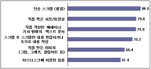 블로그 포스팅 활동을 보다 세부적으로 살펴보기 위해 주로 활용하는 포스팅 방식을 5점 척도로 질문한 뒤 이 중 “가끔 사용하는 편”에 속하는 3점 이상의 응답을 기록한 결과를 취합한 결과에서도 단순 스크랩이 가장 높은 비중을 차지하는 등 상당히 소극적인 방식의 블로그 활용을 보이고 있는 것으로 나타났다.