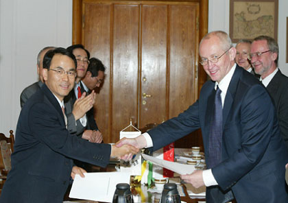 방문한 진대제 장관이 3일(현지시각) 크지쉬토프 오파프스키 폴란드 기반부 장관(오른쪽)과 양국간 IT협력을 강화하는
