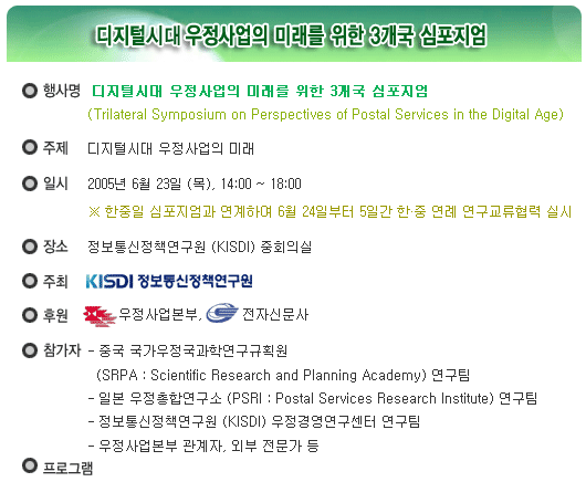 개회식 o 개회사 o 환영사 - KISDI 원장 o 축 사 - 우정사업본부장 o 인사말 - 중국측 / 일본측 |