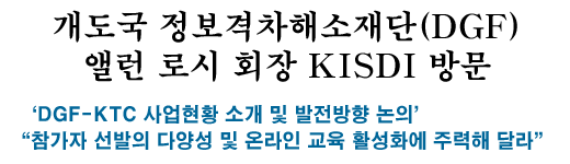 이번 앨런 로시 회장의 방문은 DGF-KTC의 운영 현황과 앞으로의 발전방향 등에 대해 함께 논의하고자 하는 취지로 이루어졌다. KISDI를 처음 방문한 앨런 로시 회장은 이주헌 원장과의 면담에서 현재 KISDI내 운영중인 DGF-KTC의 사업 성과들에 대해 큰 만족을 표시하며 감사를 전했고, 이원장은 향후 정보격차해소사업에 KISDI가 더 큰 도움이 될 수 있기를 바란다고 답했다.
