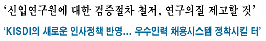 지난해부터 KISDI는 우수 연구인력 확보를 위한 다양한 노력을 기울여왔다. 박사급 인력 채용에 있어 전공분야를 다양화했으며 이주헌 원장이 직접 우수인력 채용을 위한 해외출장에 나서기도 했다. 또한 연구원 인사제도를 개선해 별정직 연구원제도를 도입, 향후 연구원 채용에 있어 반드시 별정직 연구원으로서의 근무경험을 통해 자신의 능력을 검증받아야만 정규직으로 채용하는 시스템을 정착시키기로 했다.