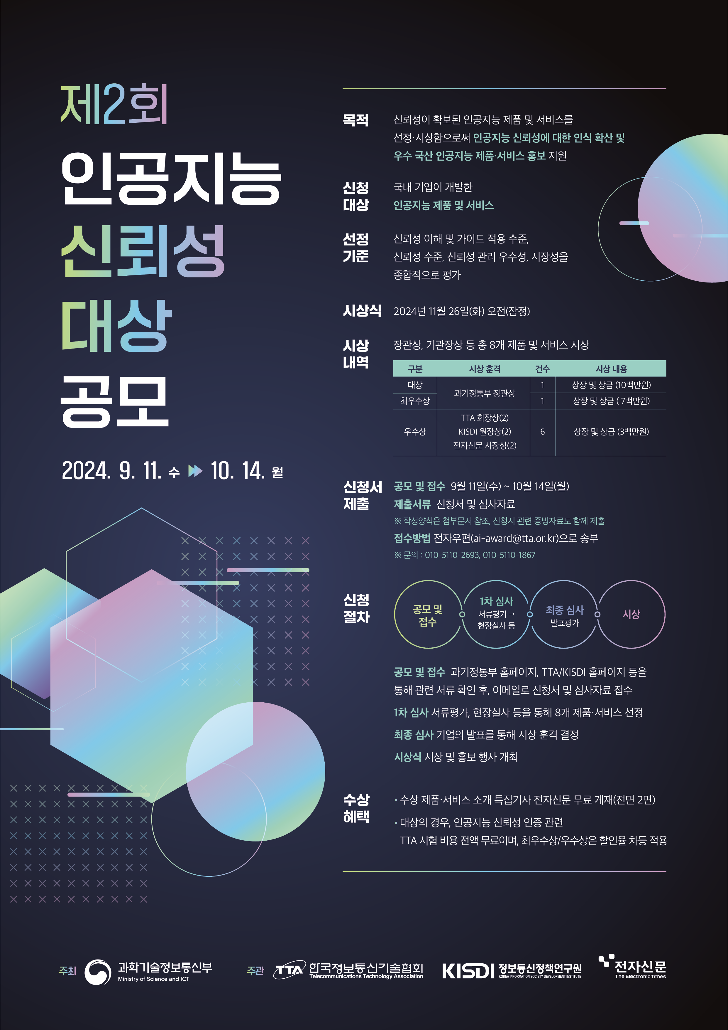 제2회 인공지능 신뢰성 대상 공모 목적: 신뢰성이 확보된 인공지능 제품 및 서비스를 선정하여, 신뢰성에 대한 인공지능 실현의 일식 확산과 우수한 인공지능 제품 및 서비스 홍보 지원. 신청 대상: 국내 기업이 개발한 인공지능 제품 및 서비스 선정 기준: 신뢰성 이력 및 가이드 적용 우수수준 신뢰성 관리 우수수준, 시장성 등을 종합적으로 평가 시상식: 2024년 11월 26일 (화) 오전 10시 시상 내역: 최우수상: 1개 - TTA 회장상 (상장 및 상금 10만원) 우수상: 6개 - KISDI 회장상 (상장 및 상금 3만원) 신청 기간: 2024년 9월 11일(수) ~ 2024년 10월 14일(월) 신청 절차: 공모 및 접수: 9월 11일(수) ~ 10월 14일(월) 제출서류: 신청서 및 신청 관련 서류 제출 제출방법: 전자메일 및 현장접수 심사: 1차 심사, 현장심사, 최종 심사 수상 혜택: 우수한 제품/서비스를 홍보할 수 있는 기회 제공. 신뢰성 인증 등 관련 지원 주최 및 주관: 과학기술정보통신부, TTA, KISDI