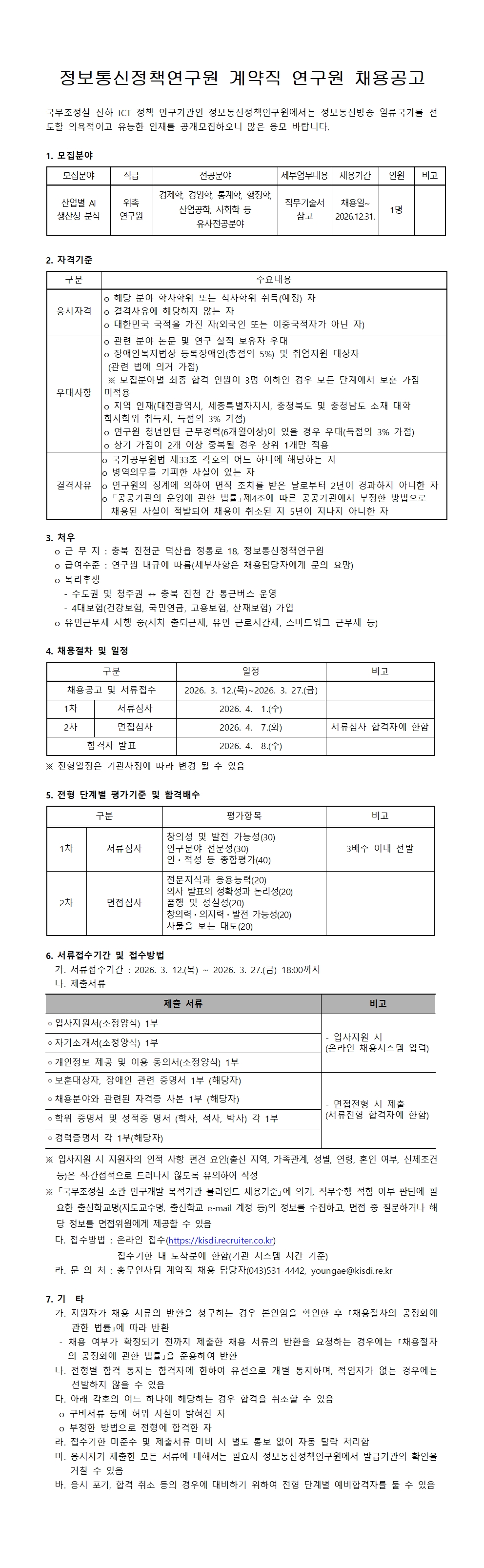 정보통신정책연구원 계약직 연구원(산업별 AI 생산성 분석) 채용공고