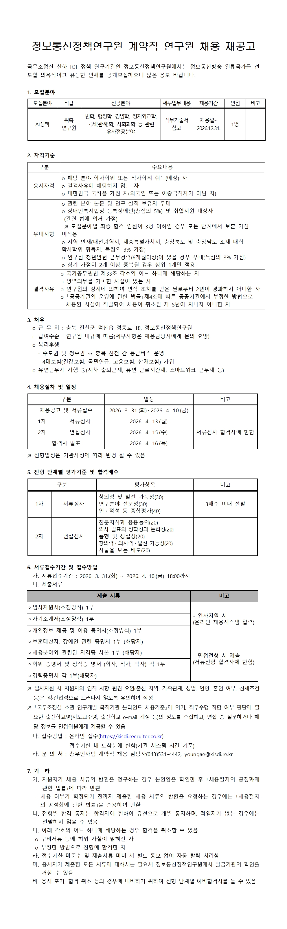 정보통신정책연구원 계약직 연구원(AI정책) 채용 재공고