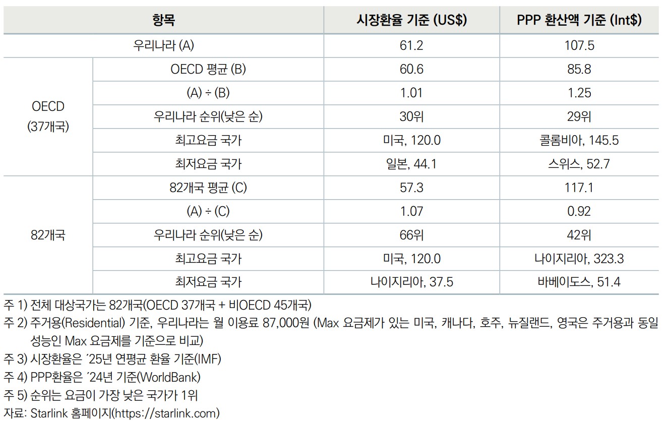 보고서에 따르면 한국의 스타링크 요금은 주거용 기준 월 8만7,000원이며, 2025년 연평균 환율 기준 61.16달러로 환산된다. 이는 OECD 소속 국가 37개국의 평균 요금(60.59달러)을 근소하게 상회하는 수준(OECD 평균 대비 1.01배 수준)이다. 현재 OECD 국가 38개국 가운데, 튀르키예를 제외한 37개국에서 스타링크가 상용화되어 있다(2026년 1월 기준).
