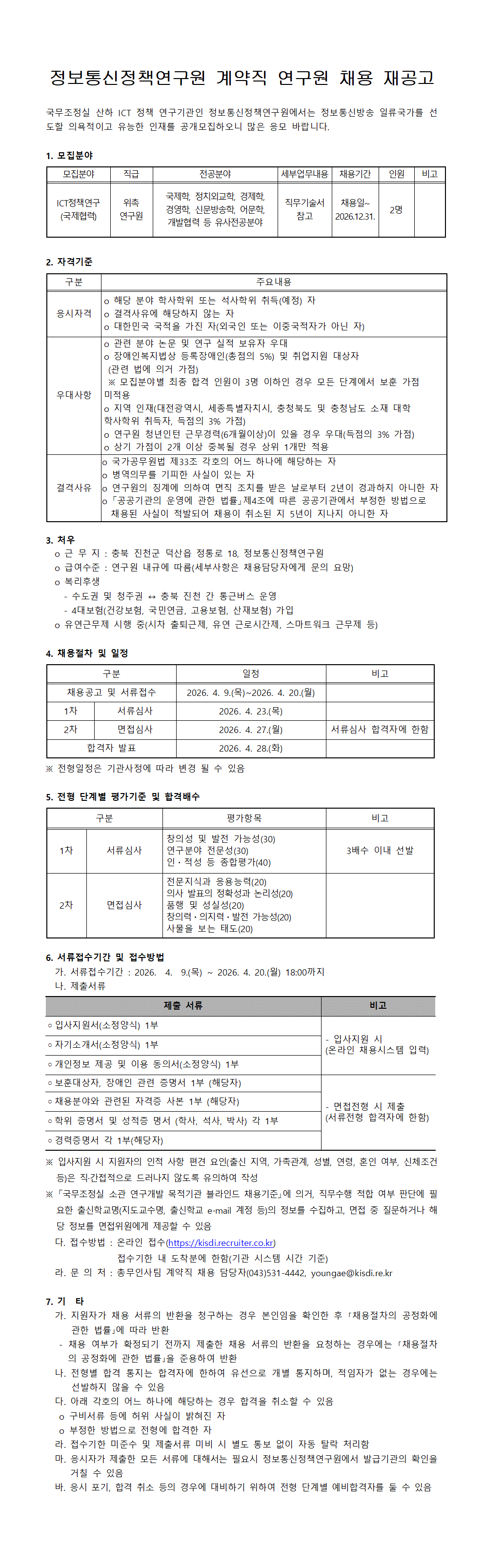 정보통신정책연구원 계약직 연구원(국제협력) 채용 재공고