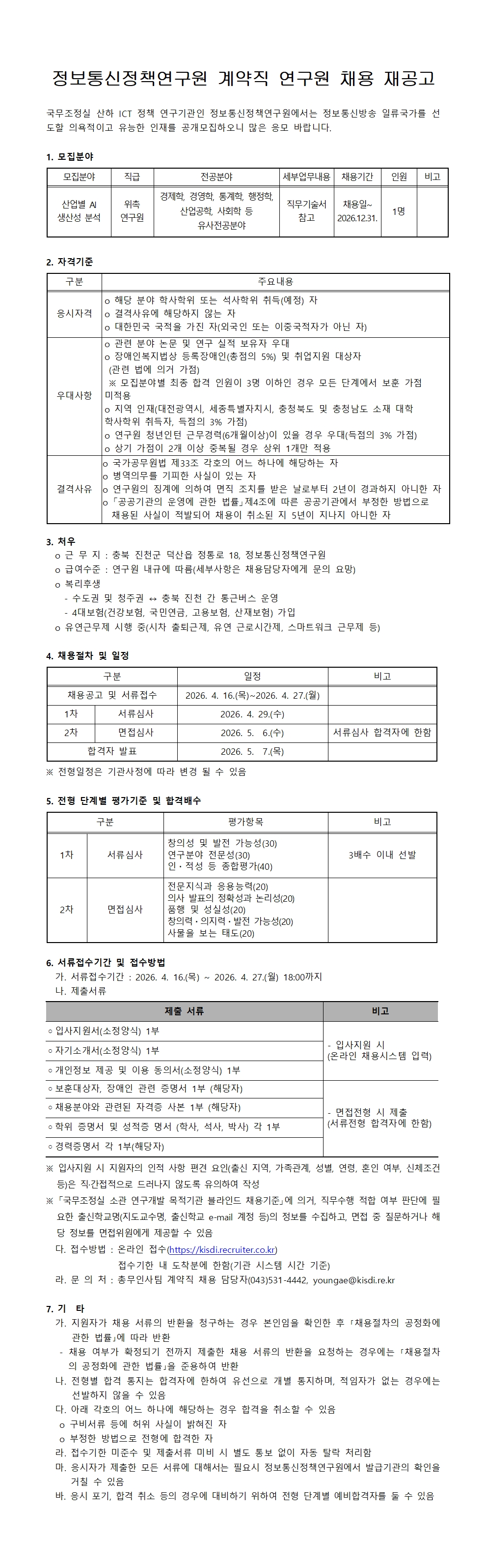 정보통신정책연구원 계약직 연구원(산업별 AI 생산성 분석) 채용 재공고