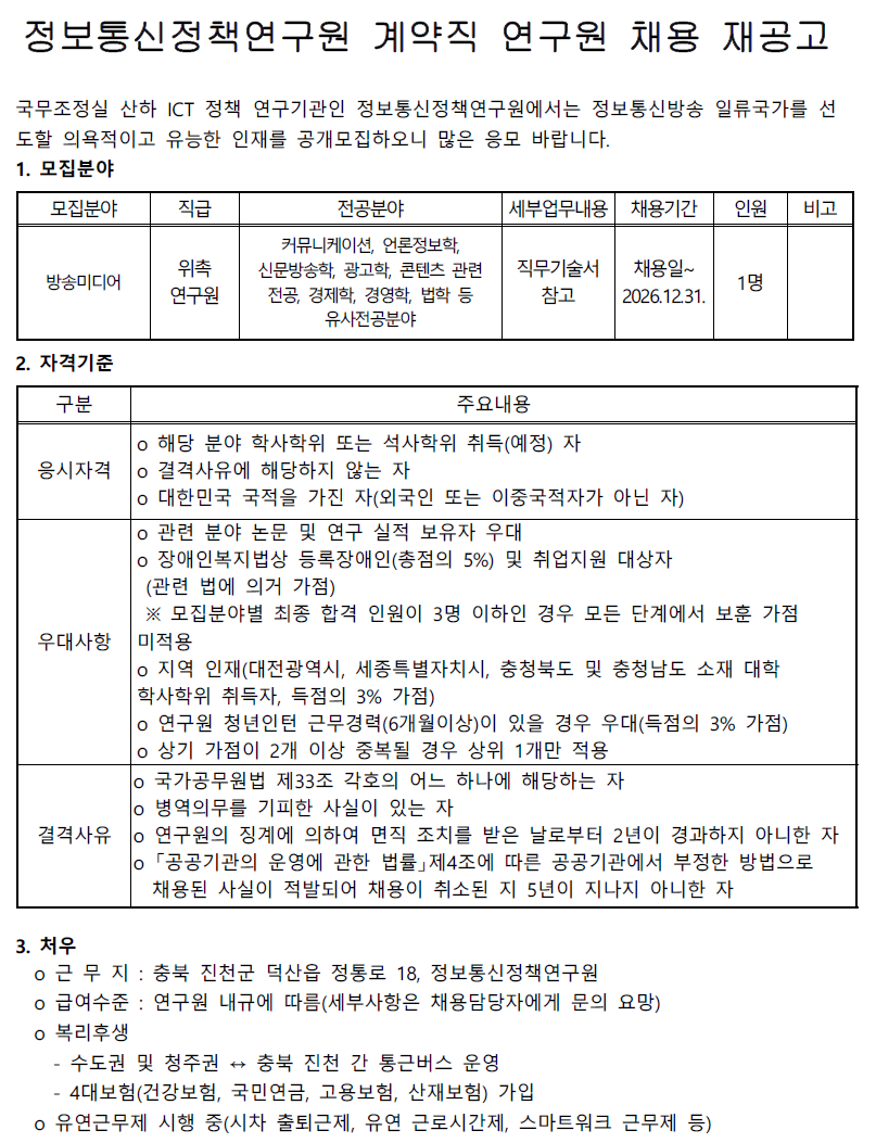 정보통신정책연구원 계약직 연구원(방송미디어) 채용 재공고